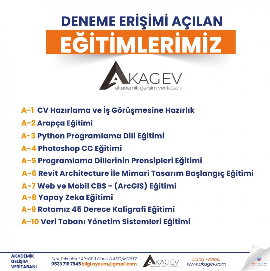 Akademik Gelişim ve Eğitim (AKAGEV), üniversite öğrencilerinin, öğretim elemanlarının ve iş dünyasının eğitim ihtiyaçlarını online ve interaktif bir ortamda sağlamak amacıyla geliştirilmiş bir veri tabanıdır. Erişim için kurumsal (edu.tr uzantılı) eposta adresiniz ile üye olup, üyelik sonrası aktivasyon maili üzerinden hesabınızı aktifleştirmeniz yeterlidir.